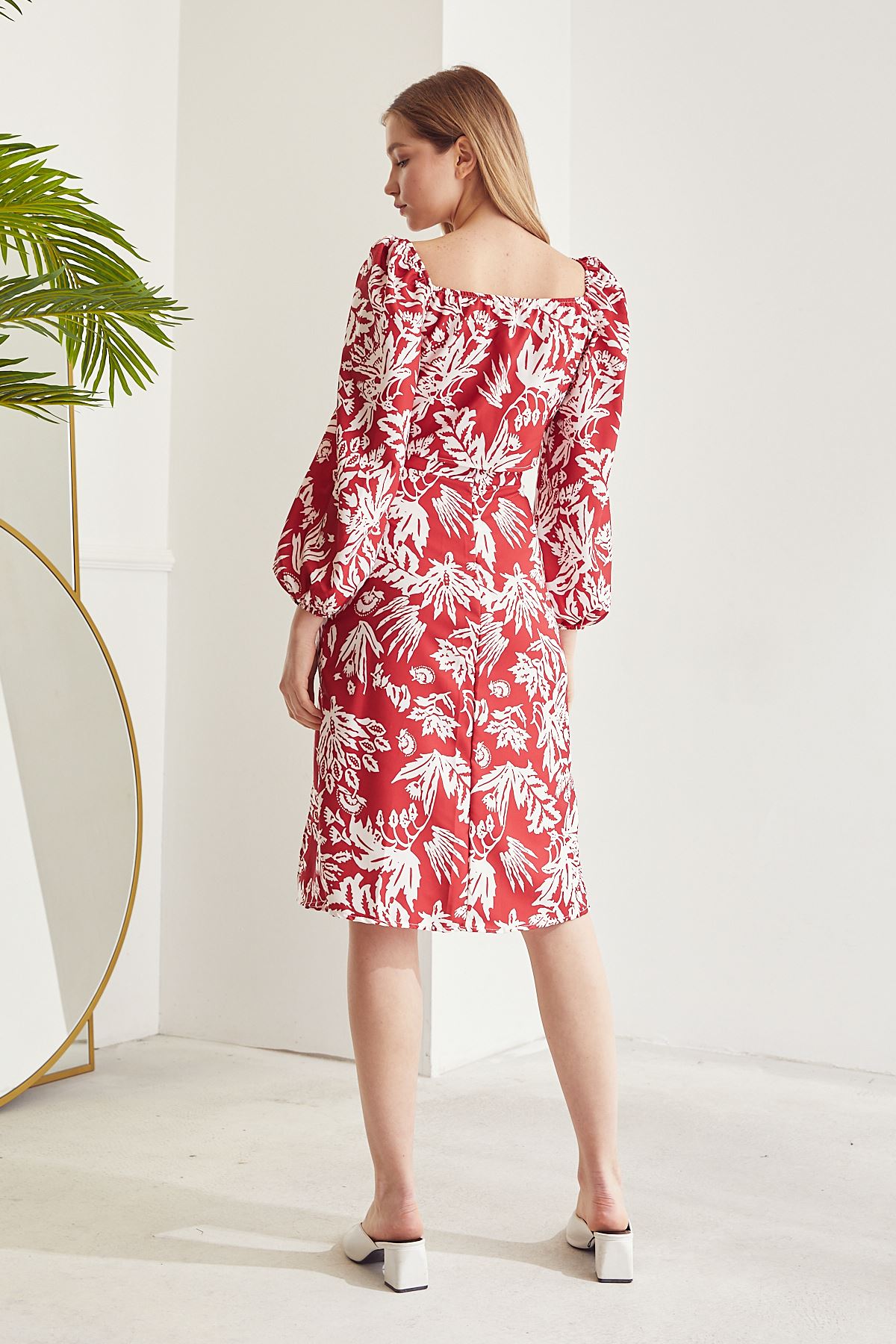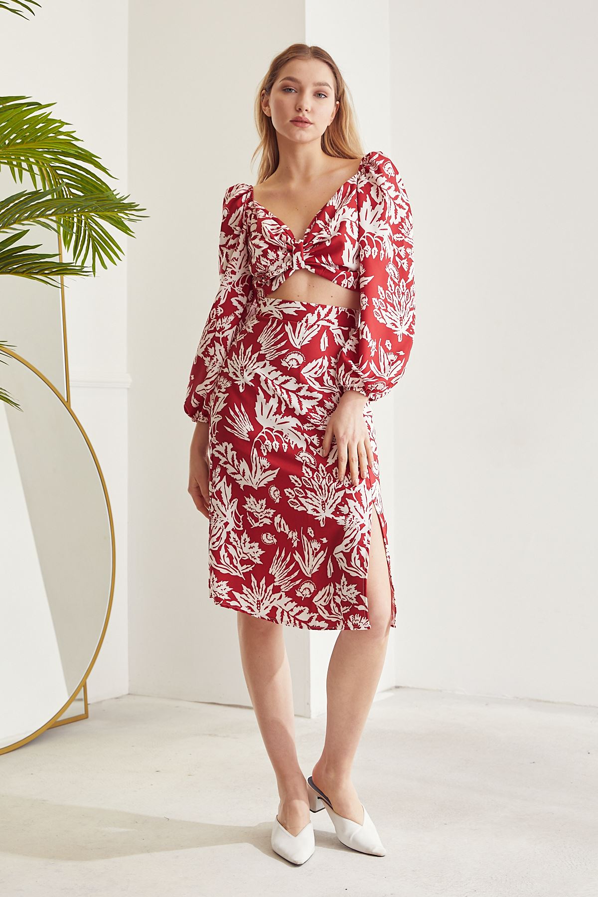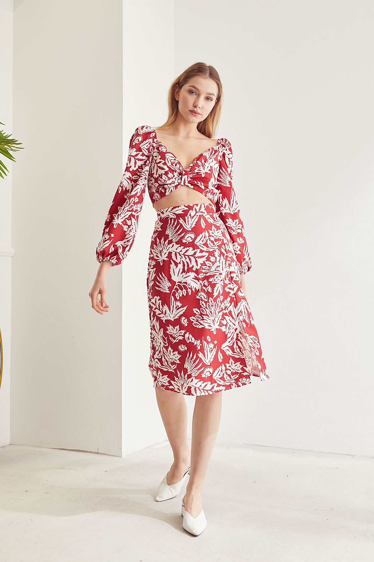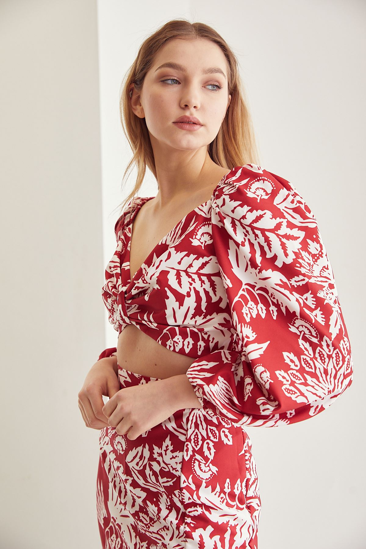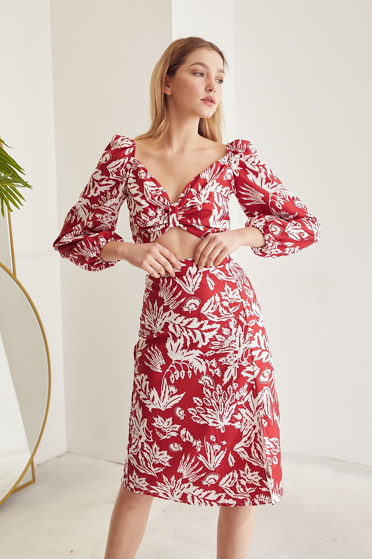 Kadın Desenli Crop Etek Takım Kırmızı