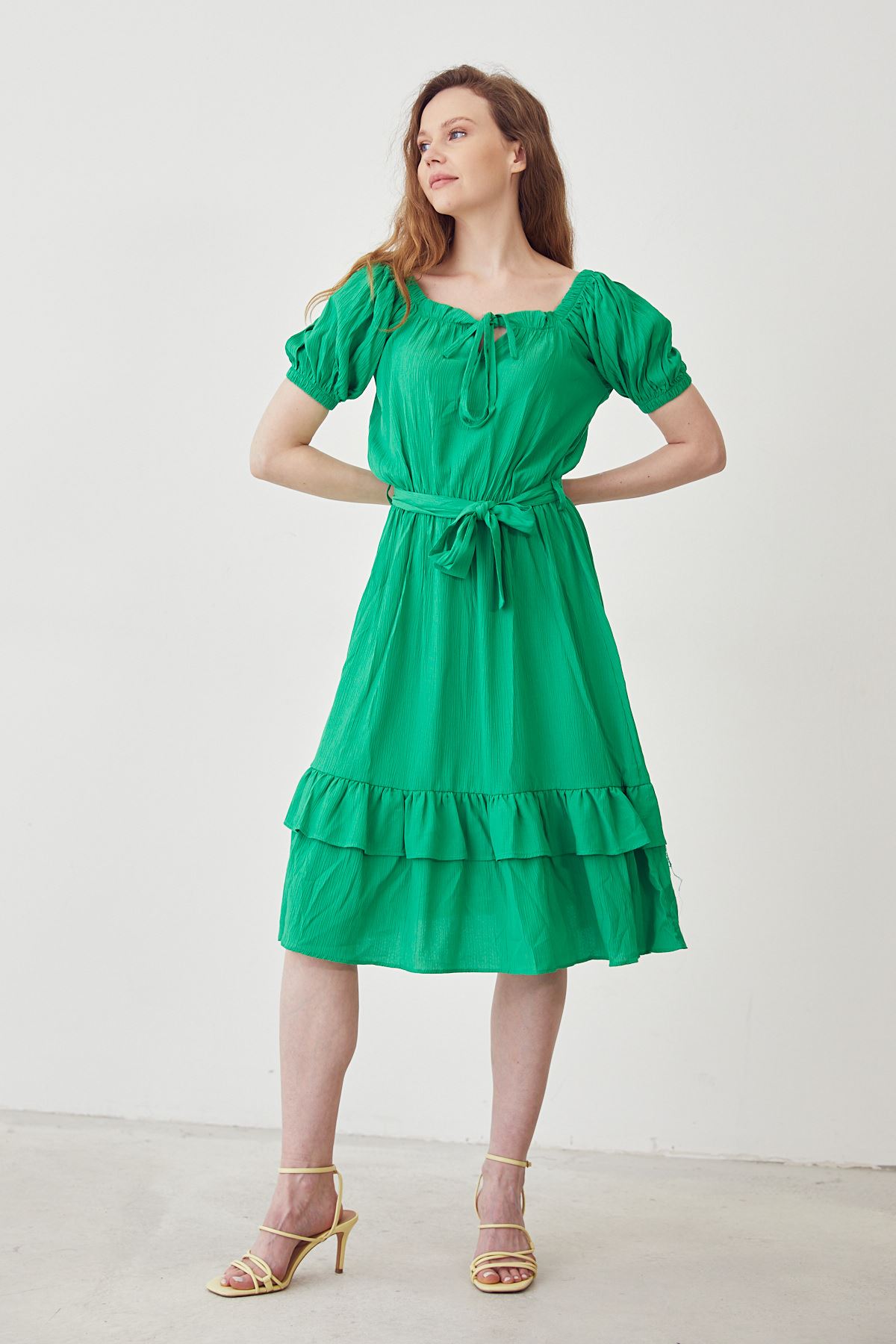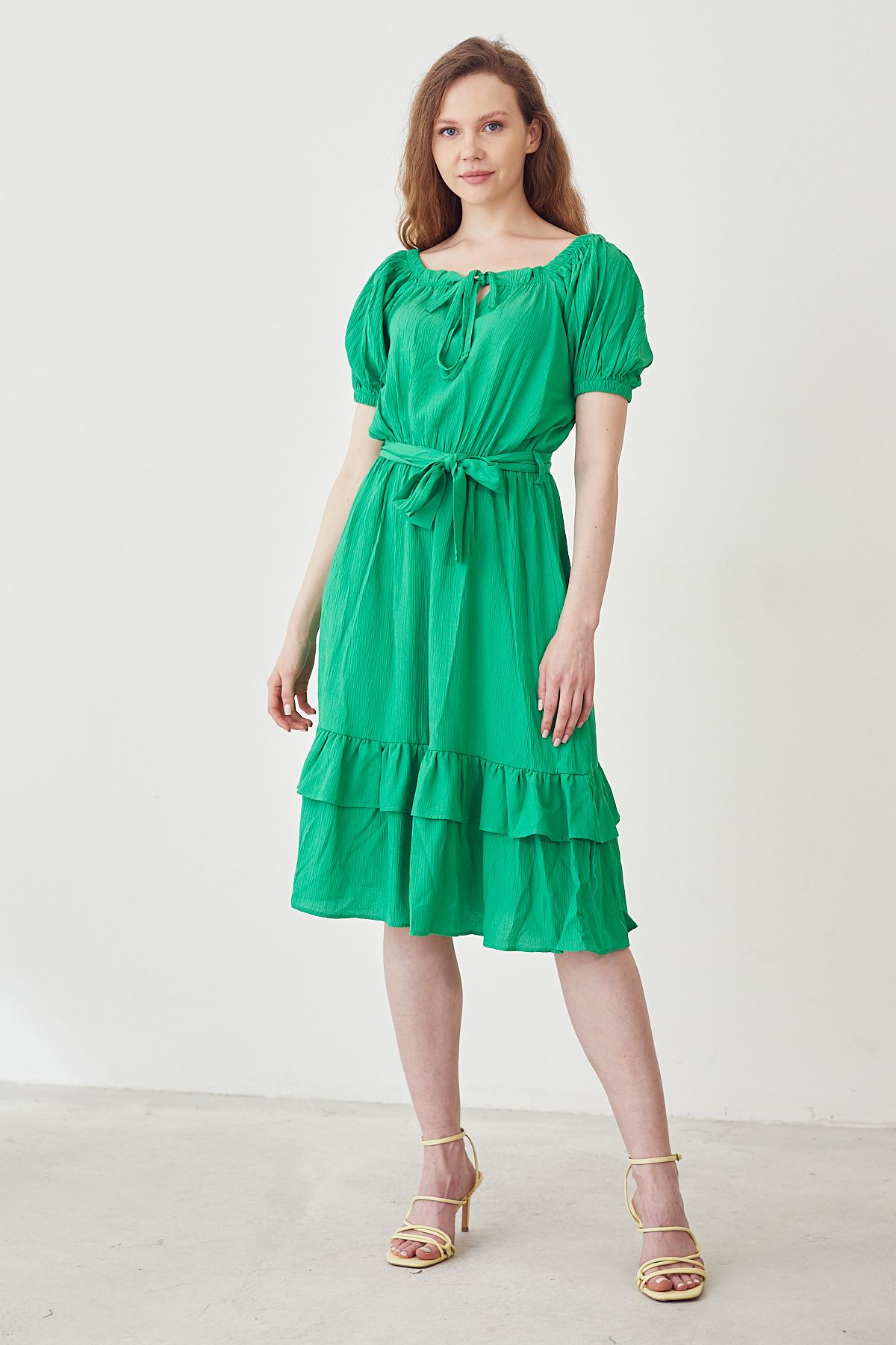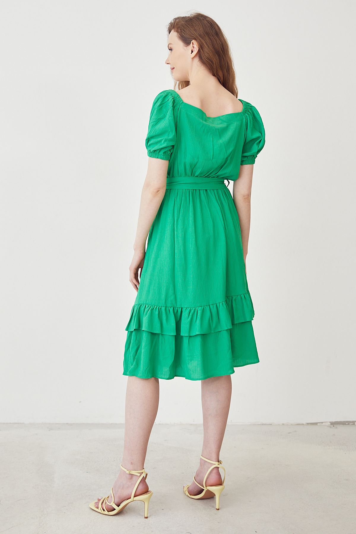 Kadın Önü Bağlama Detaylı Eteği Volanlı Elbise Yeşil