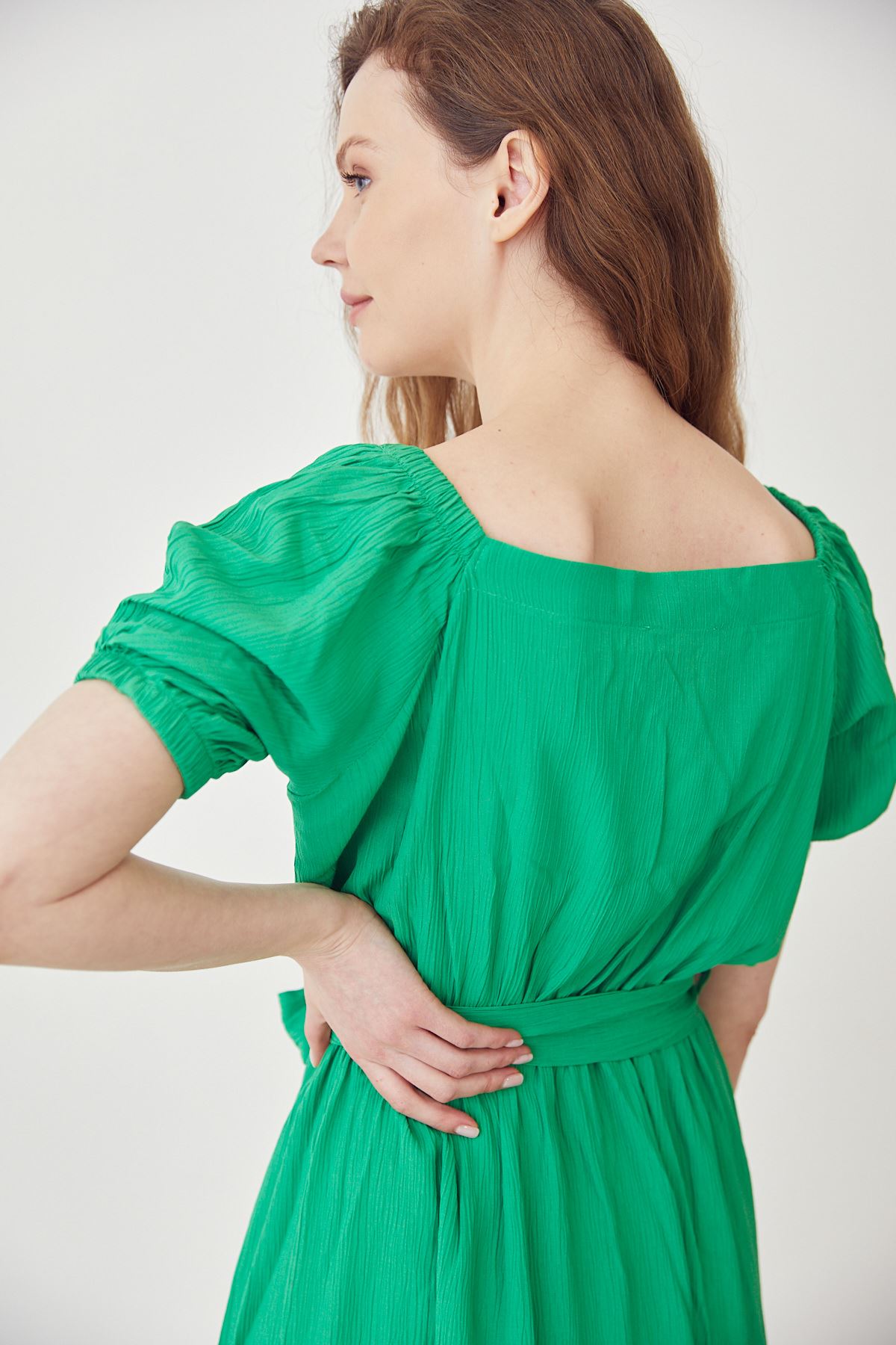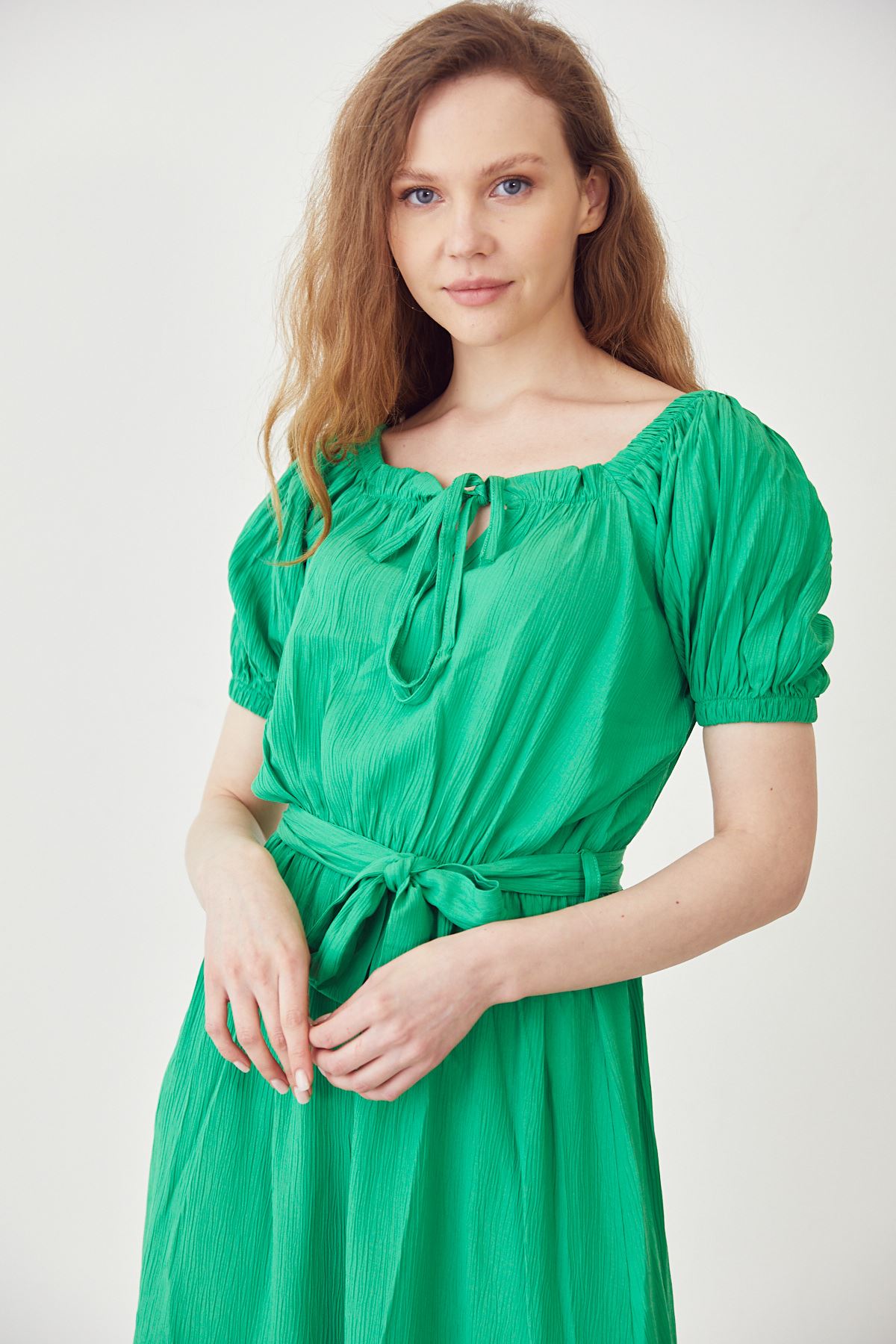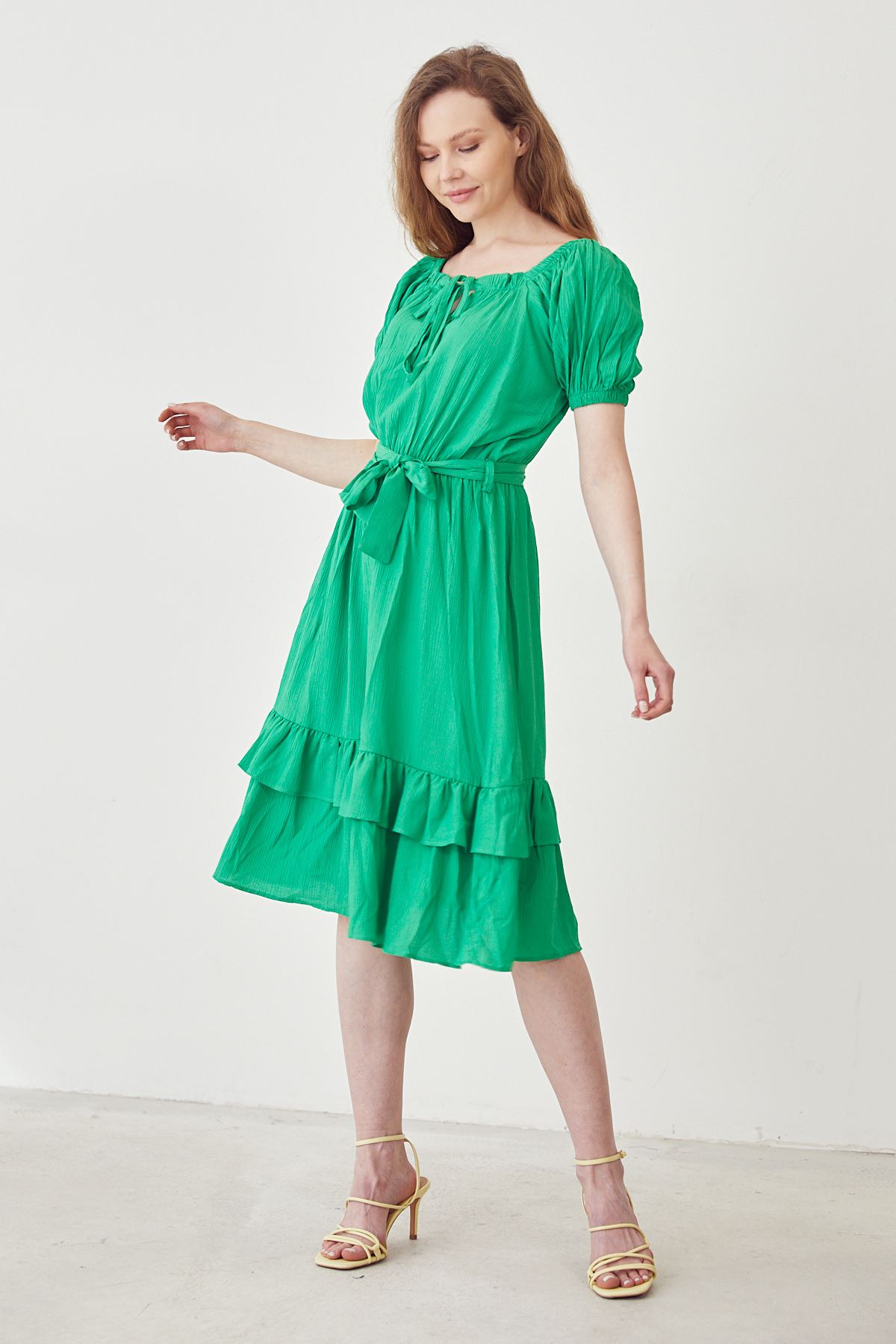 Kadın Önü Bağlama Detaylı Eteği Volanlı Elbise Yeşil