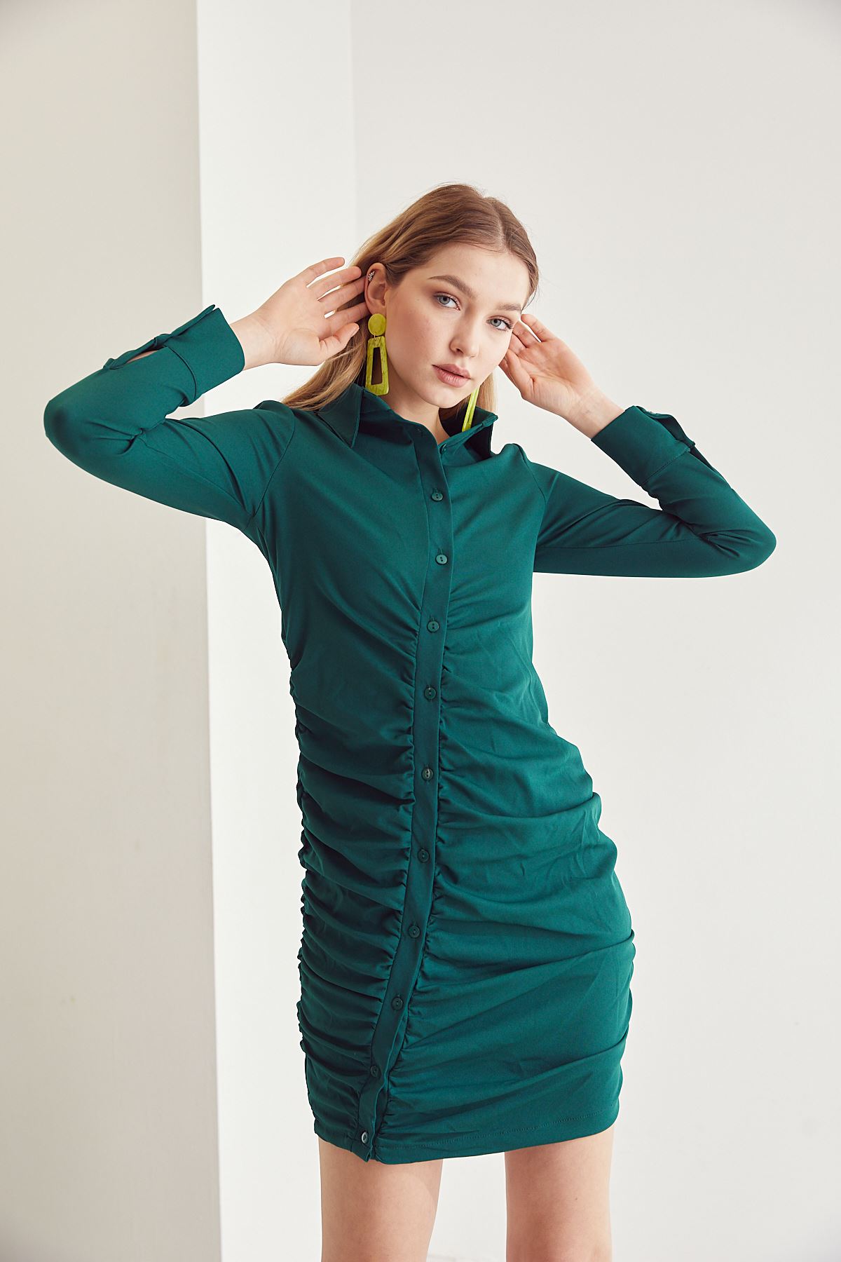 Kadın Boydan Düğmeli Gömlek Yaka Ön Büzgülü Elbise Yeşil
