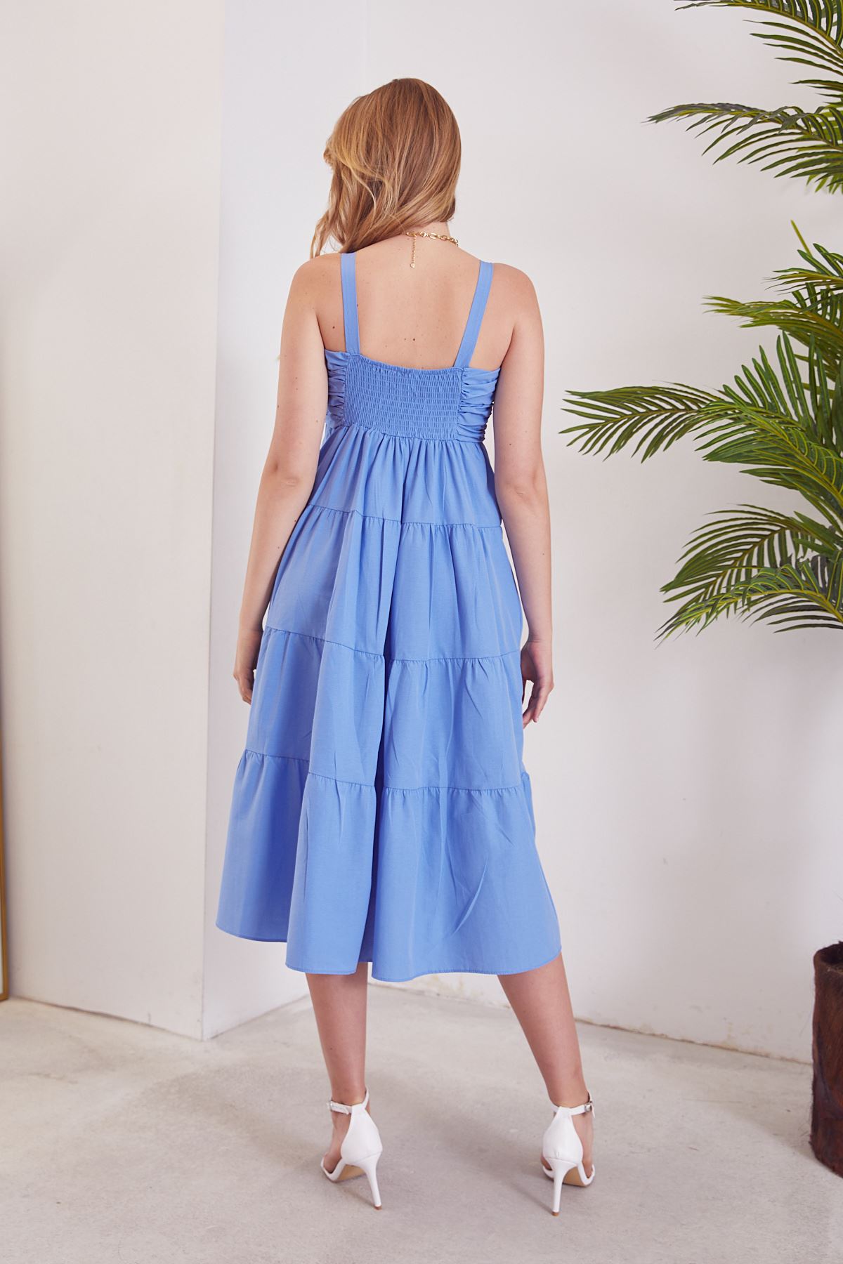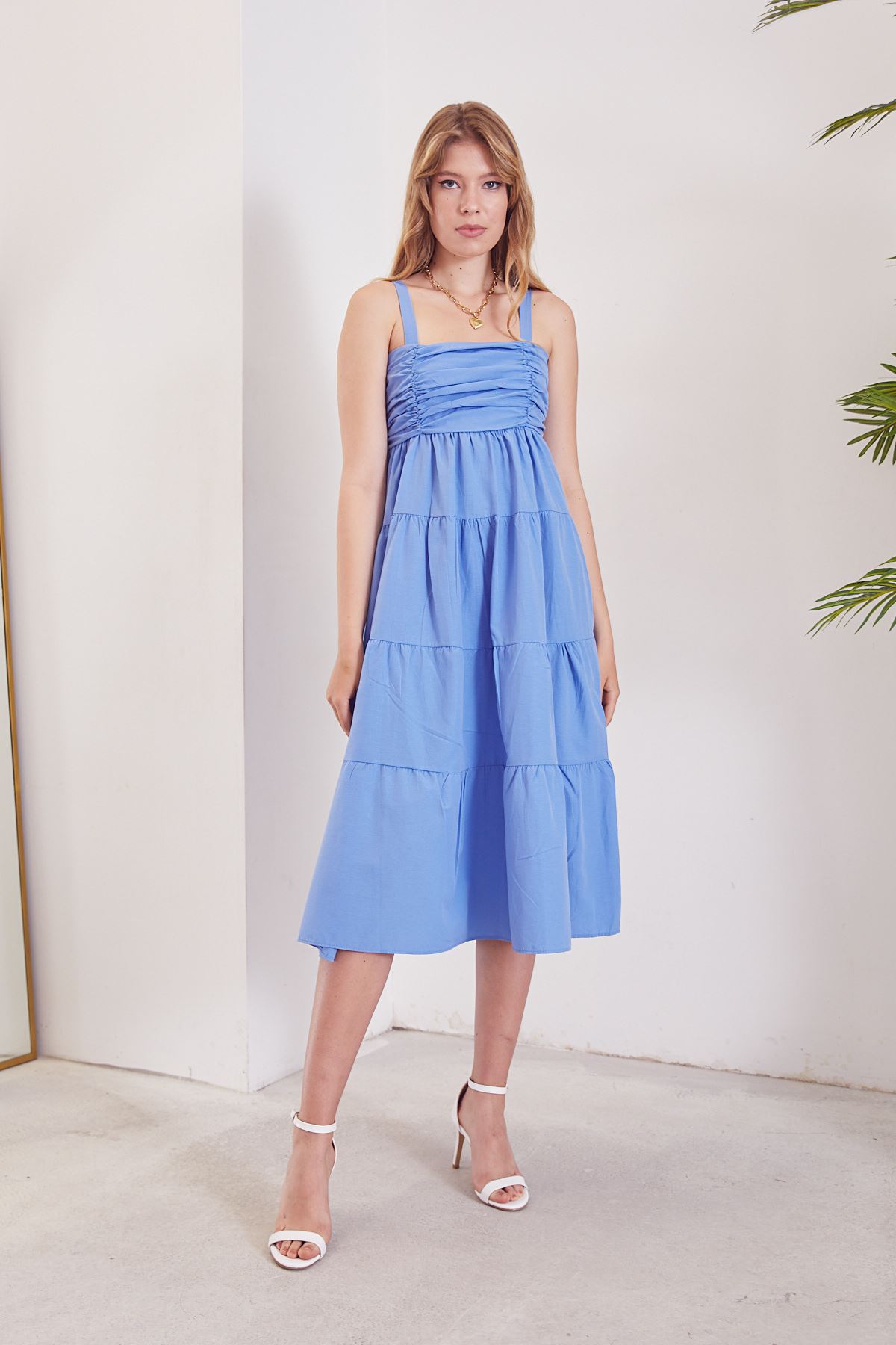 Kadın Önü Büzgülü Askılı Kat Kat Poplin Elbise Mavi