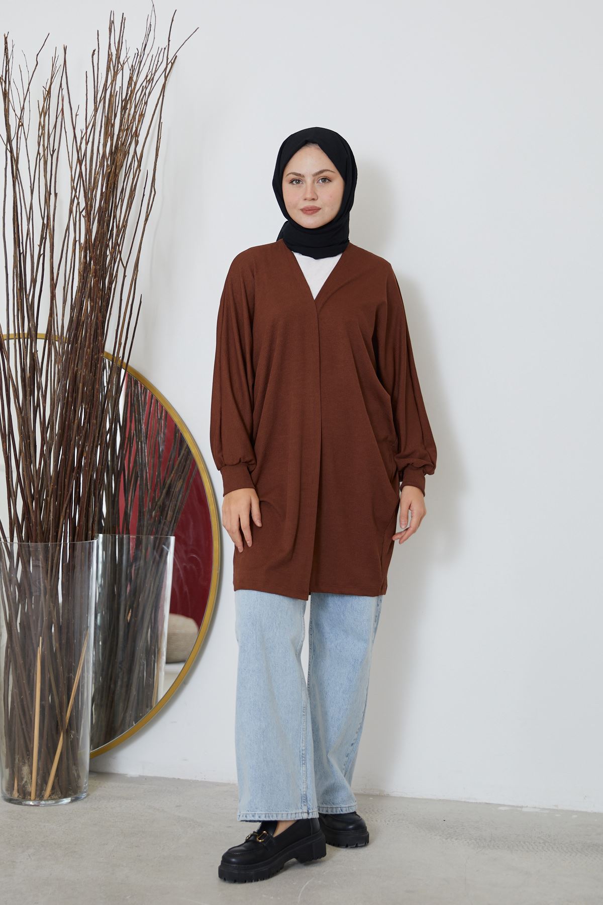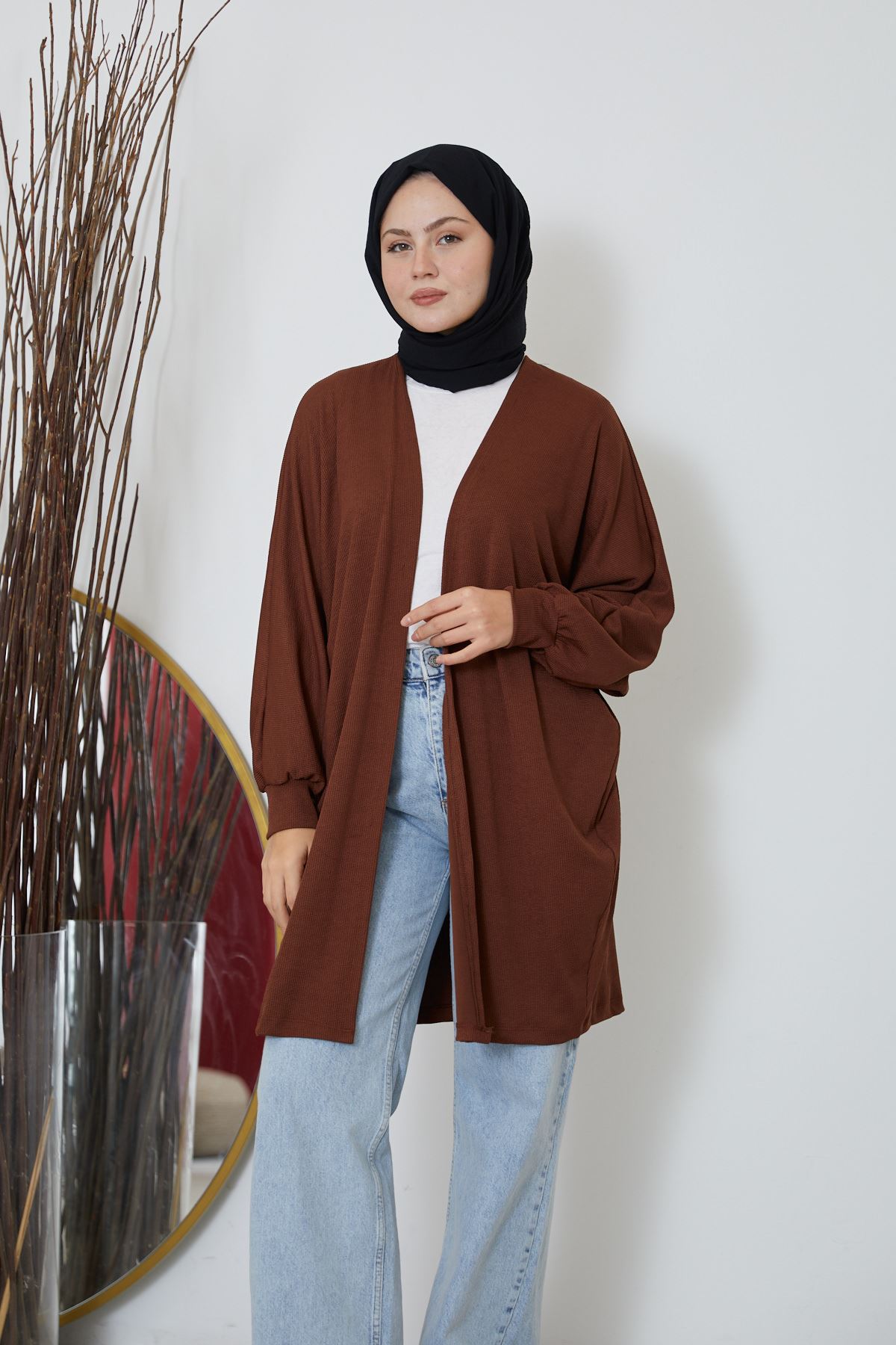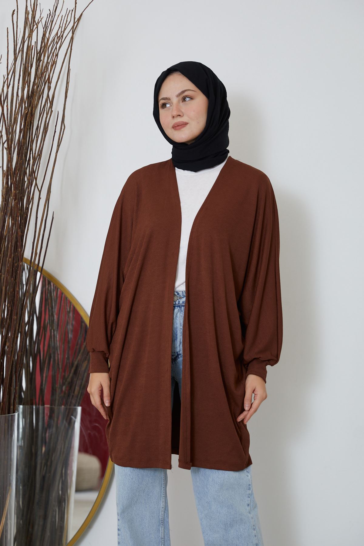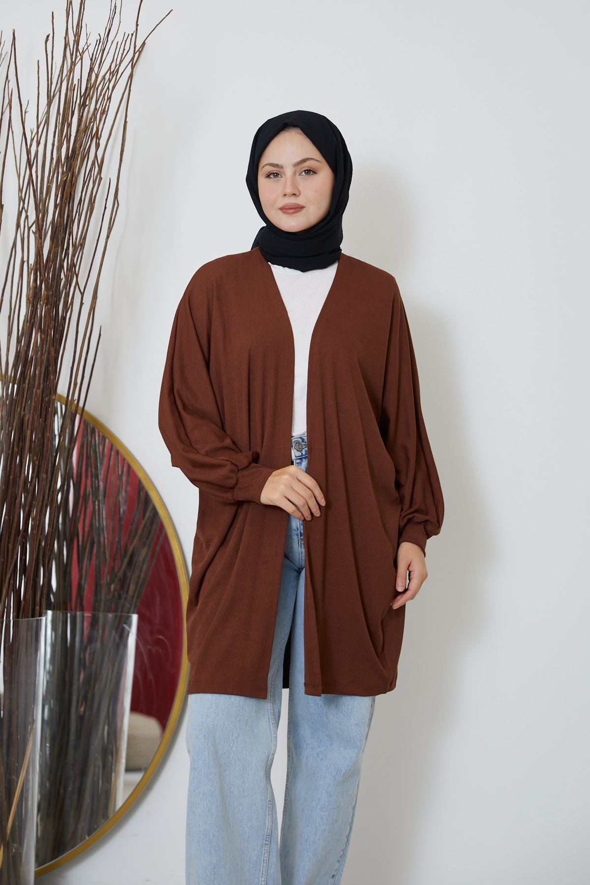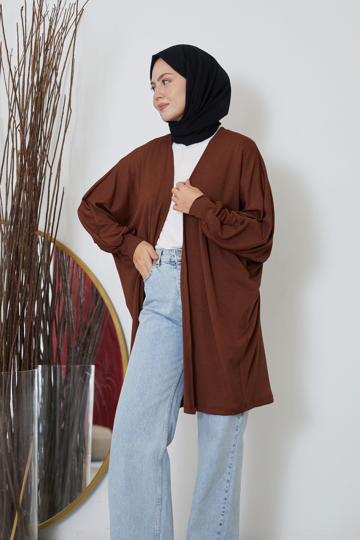 Kadın Yarasa Kol Detaylı Salaş İnce Yazlık Giy Çık Tesettür Hırka-Kahve
