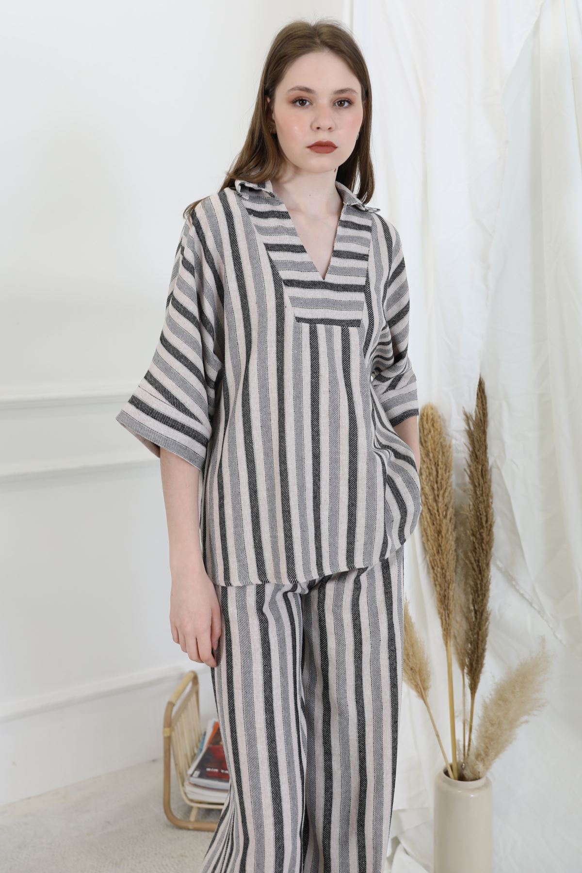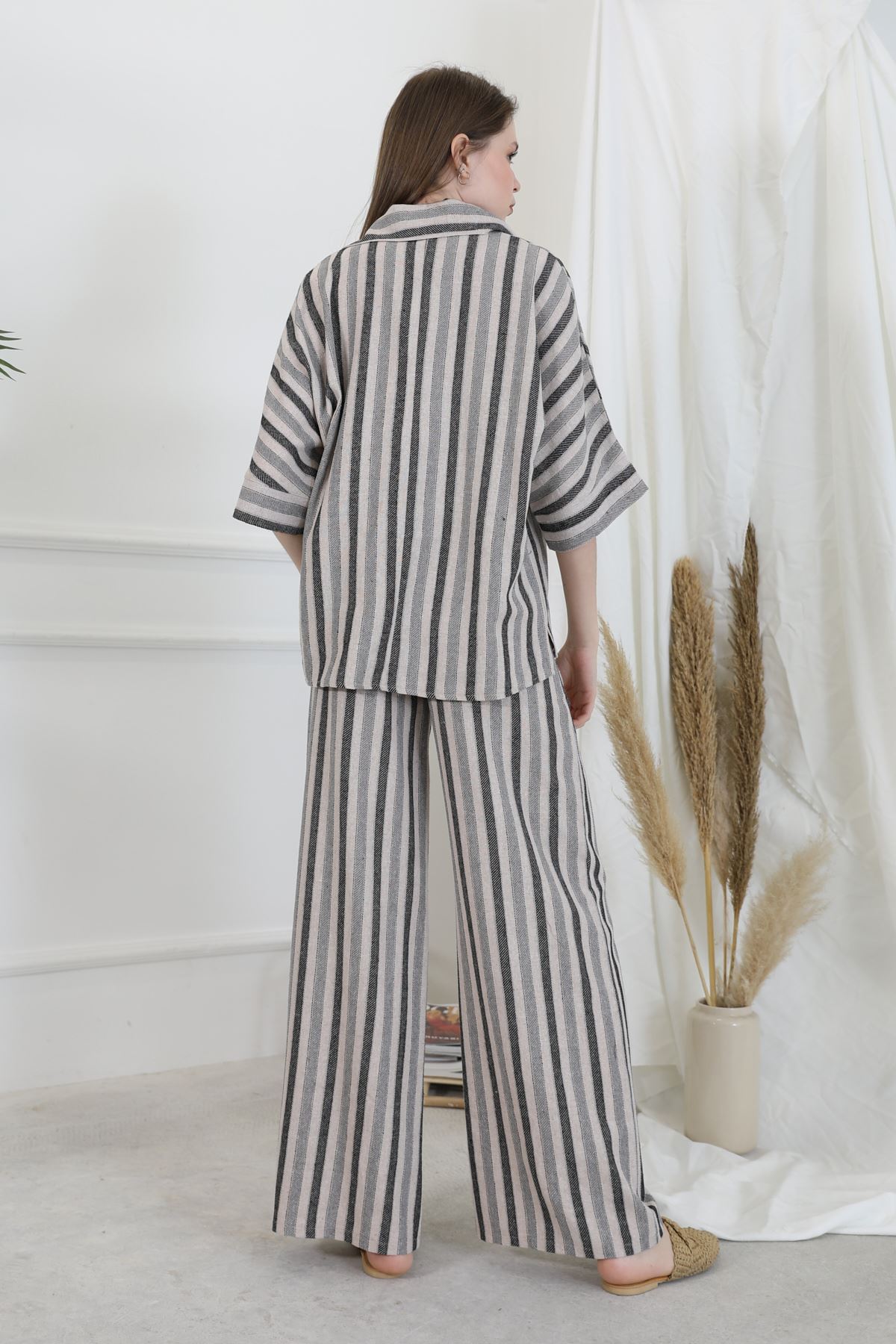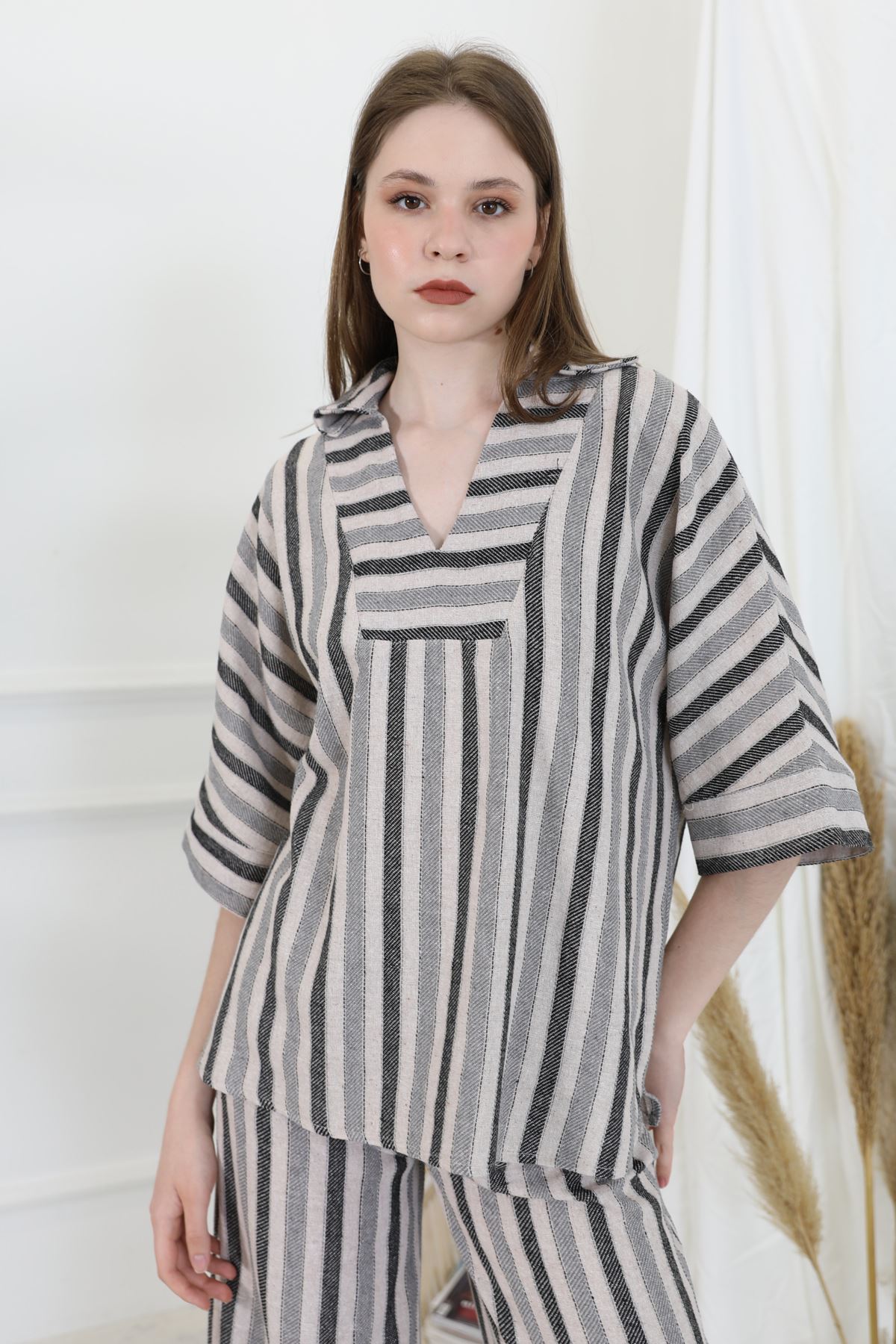 Kadın V Yaka Çizgili Yarım Kol Rahat Kalıp Yazlık Keten Takım Siyah