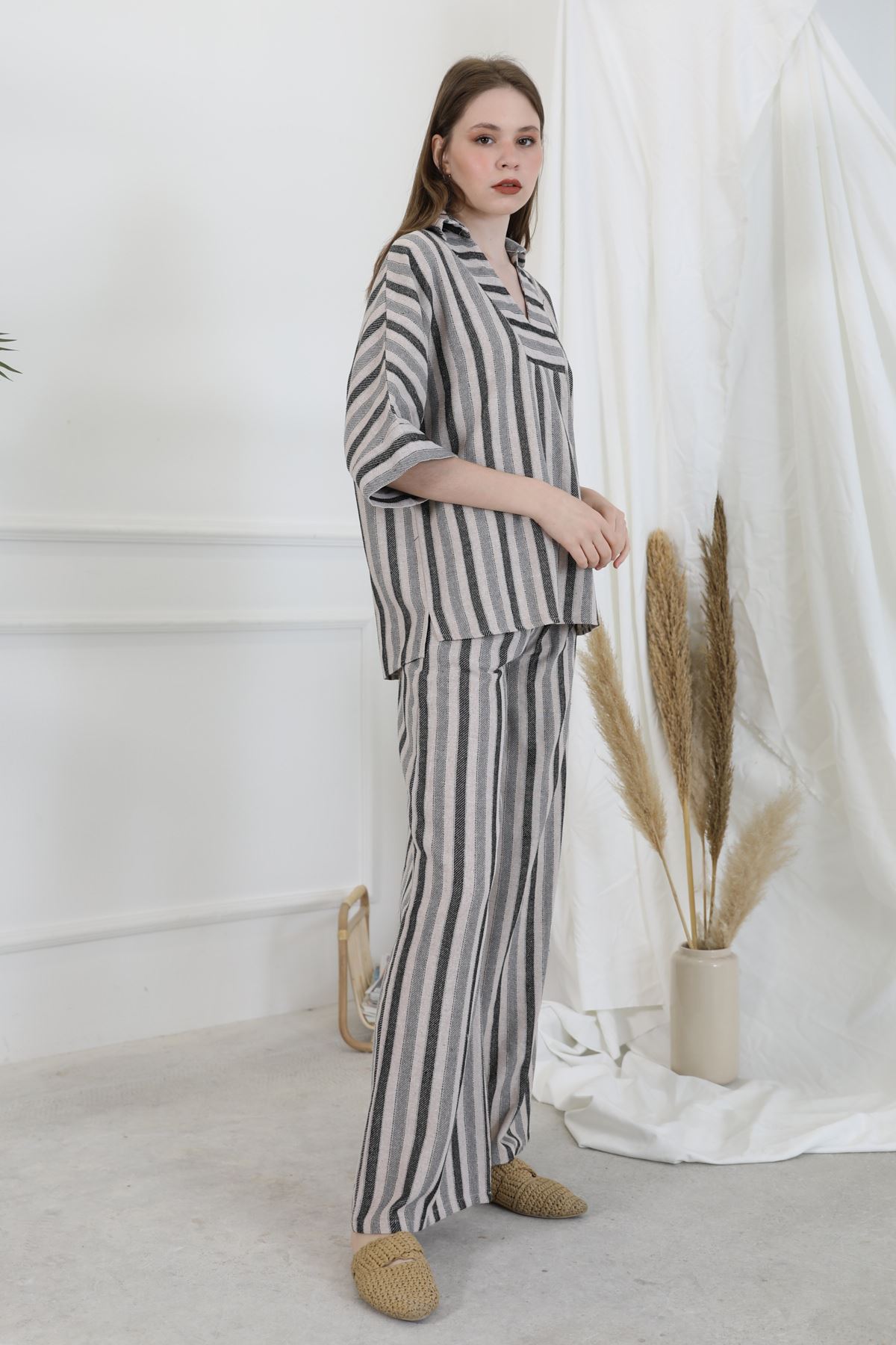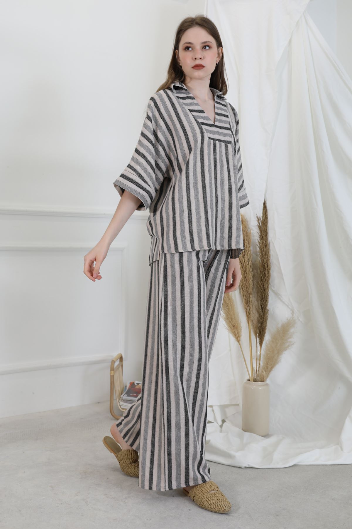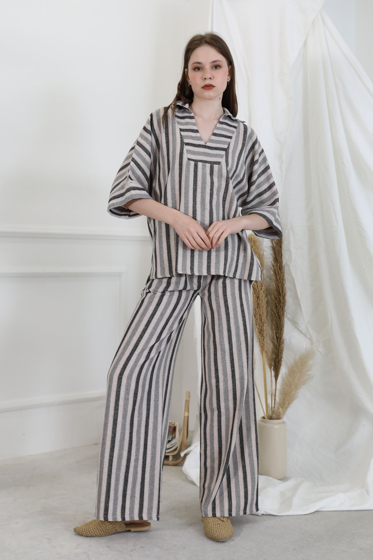 Kadın V Yaka Çizgili Yarım Kol Rahat Kalıp Yazlık Keten Takım Siyah